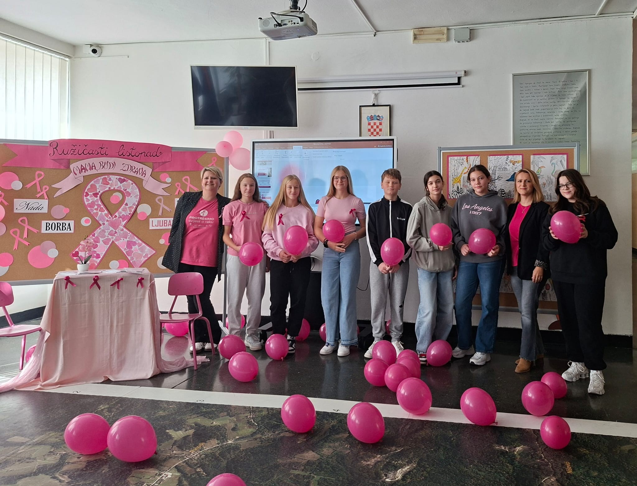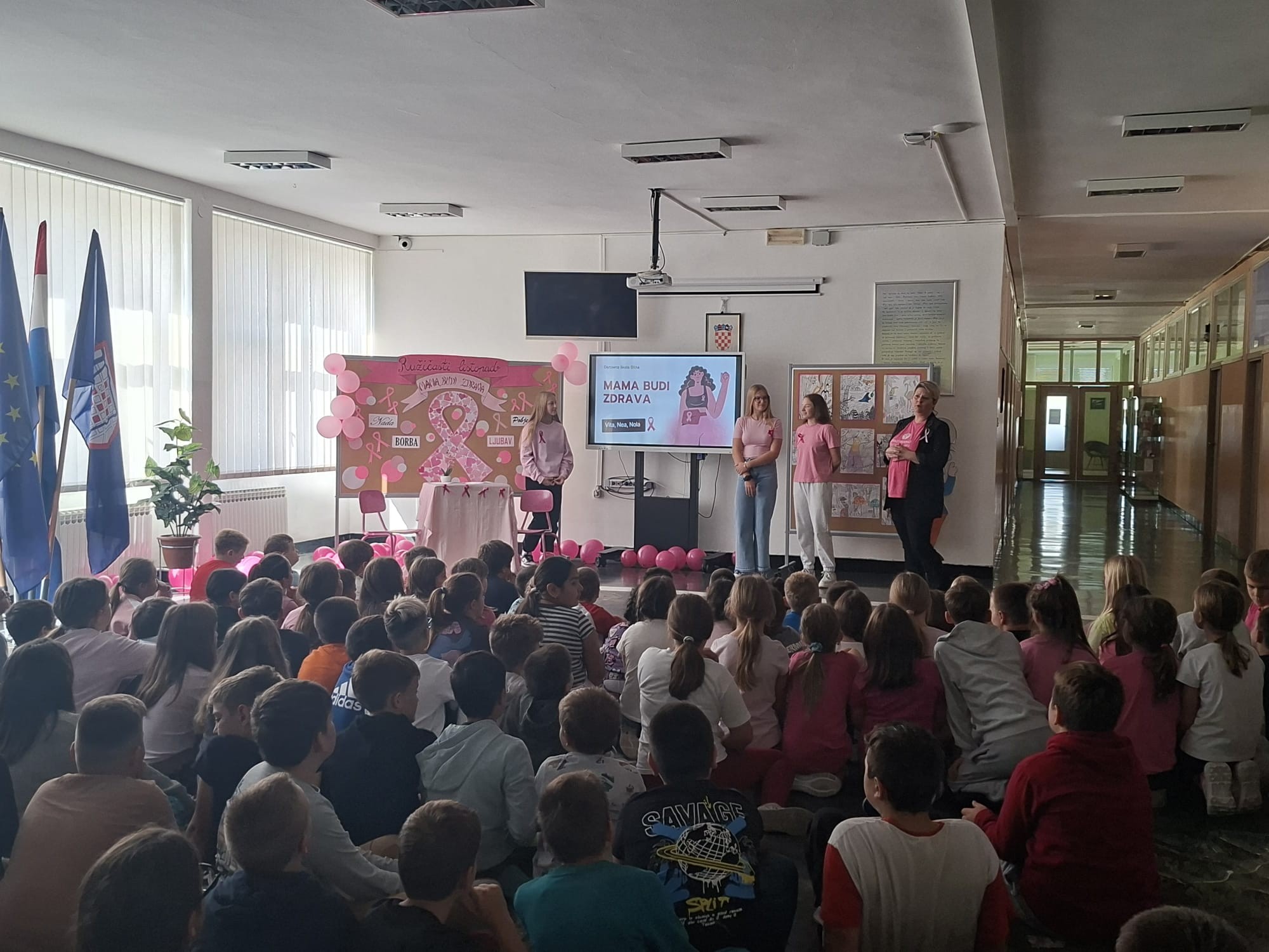 I ove godine u našoj školi prigodno smo obilježili Ružičasti listopad sudjelujući u akciji Mama budi zdrava. Prigodnu prezentaciju pripremile su učenice 8.c razreda uz mentorstvo učiteljice Gordane Božić - Ančić, a hol je ukrasila likovna skupina pod mentorstvom učiteljice Diane Cestarić. Prigodni letci podijeljeni su svim učenicima naše škole kako bi potaknuli svoje mame, bake i ostale žene na preventivne preglede.