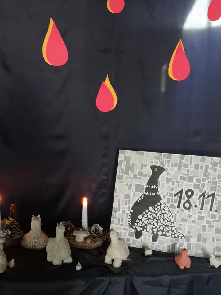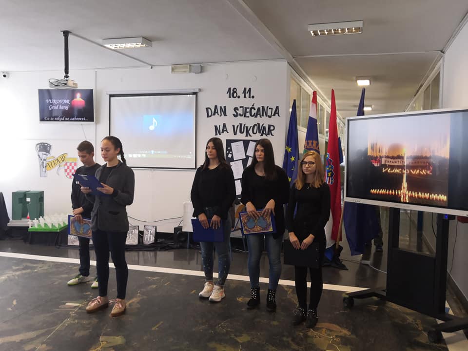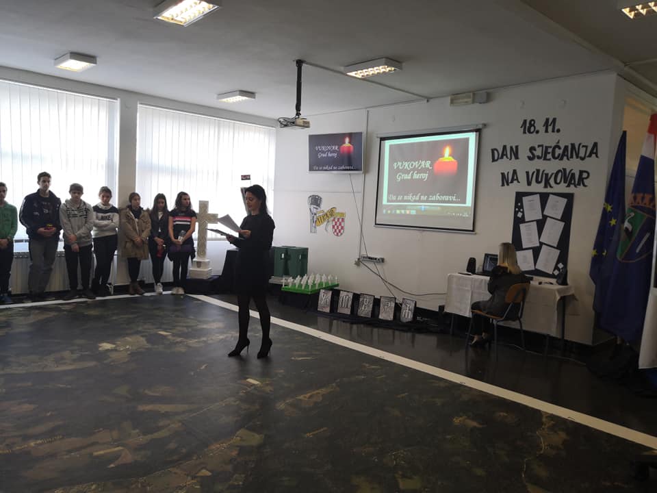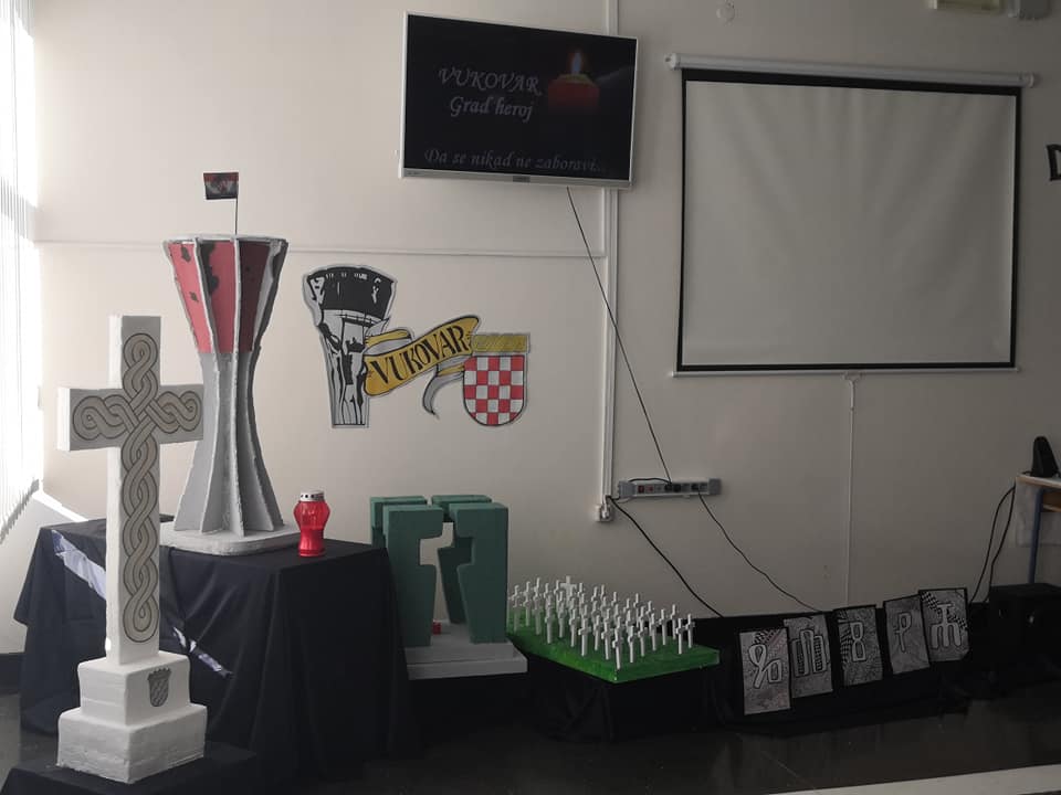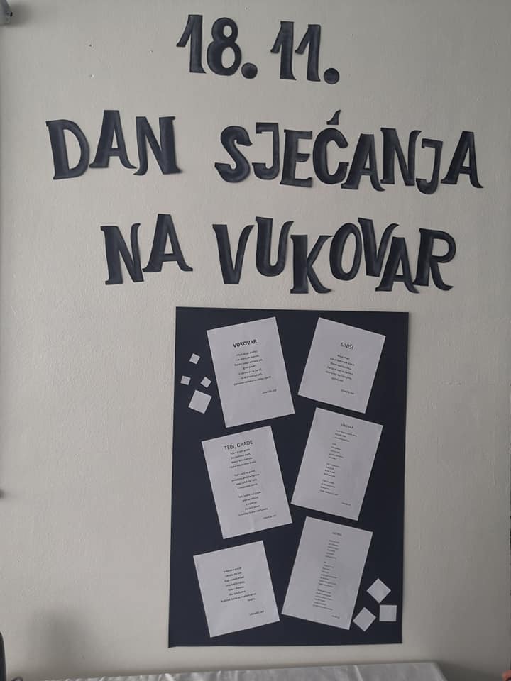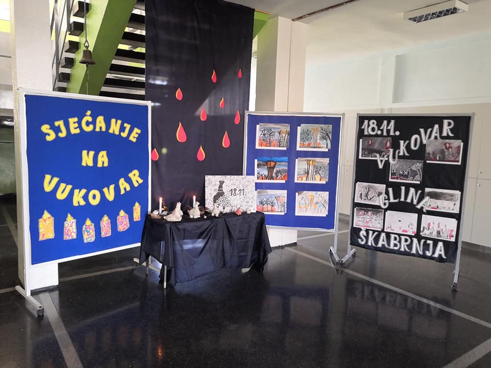 Hol škole u prizemlju i na katu uredili su učenici razredne i predmetne pod vodstvom svojih učiteljica i mentorica te kroz likovne i literarne radove istaknuli su značaj Dana sjećanja na žrtve Vukovara, Gline, Škabrnje i svih stradalih krajeva naše Domovine.
