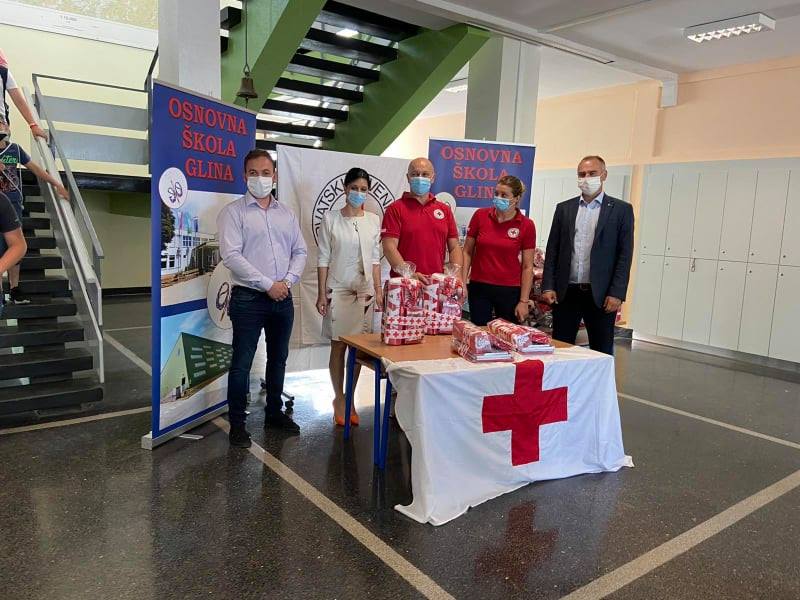 Donaciju paketa uručili su ravnateljici naše škole izvršni predjednik Hrvatskog Crvenog križa gospodin Robert Markt u pratnji suradnika i ravnateljica Crvenog križa Glina gospođa Alberta Cestarić u pratnji suradnika.