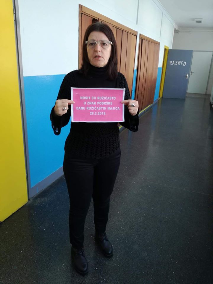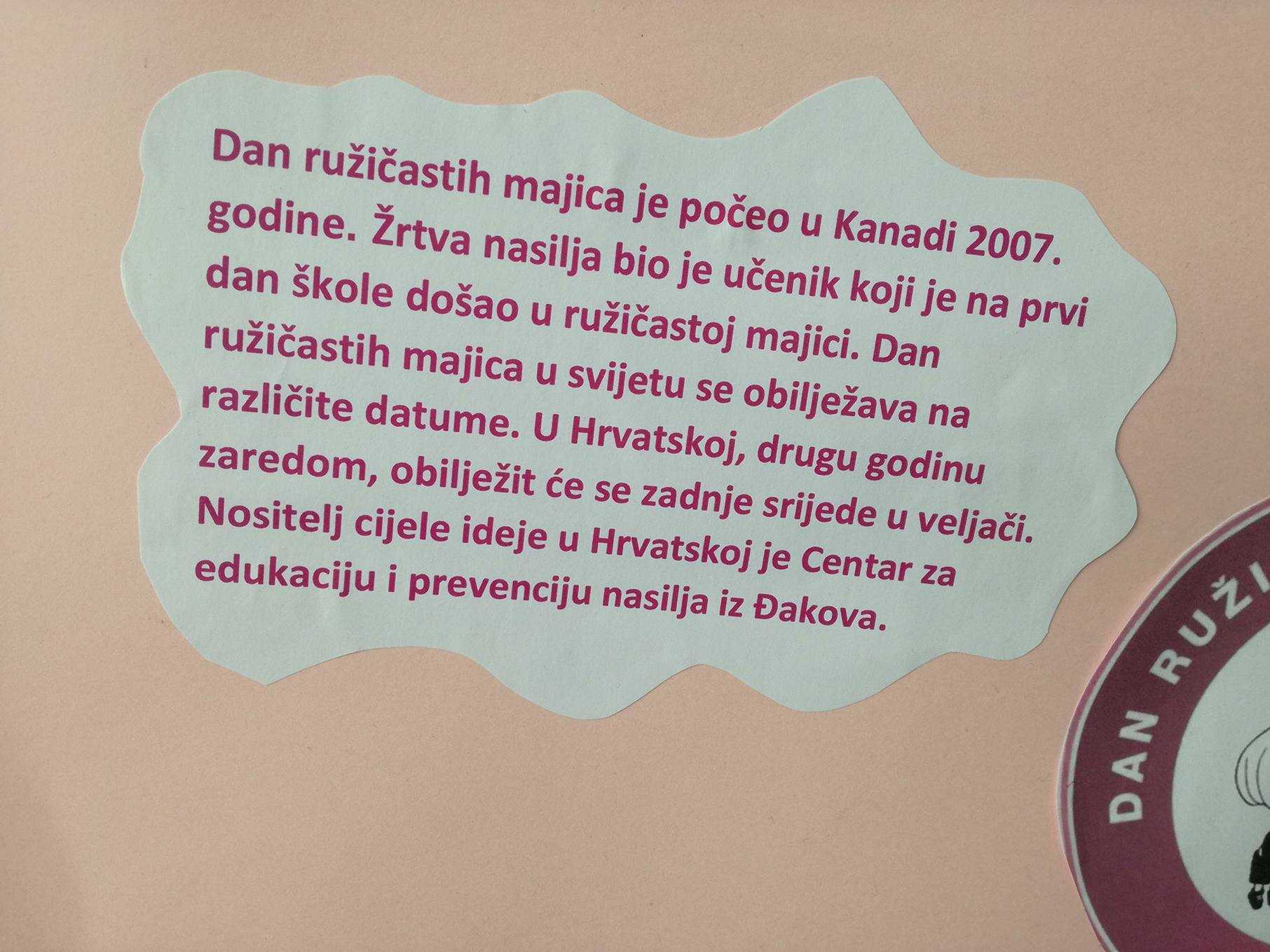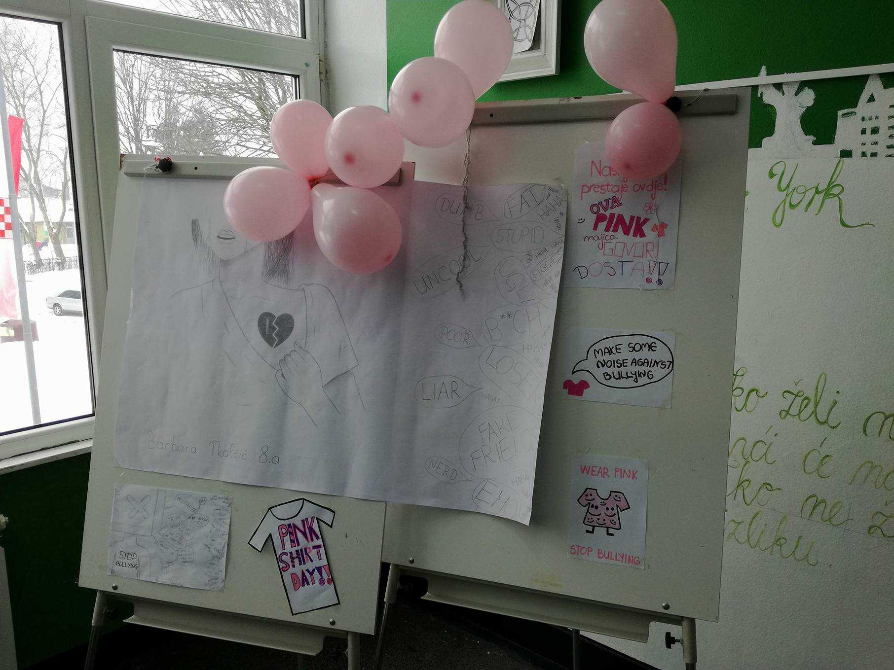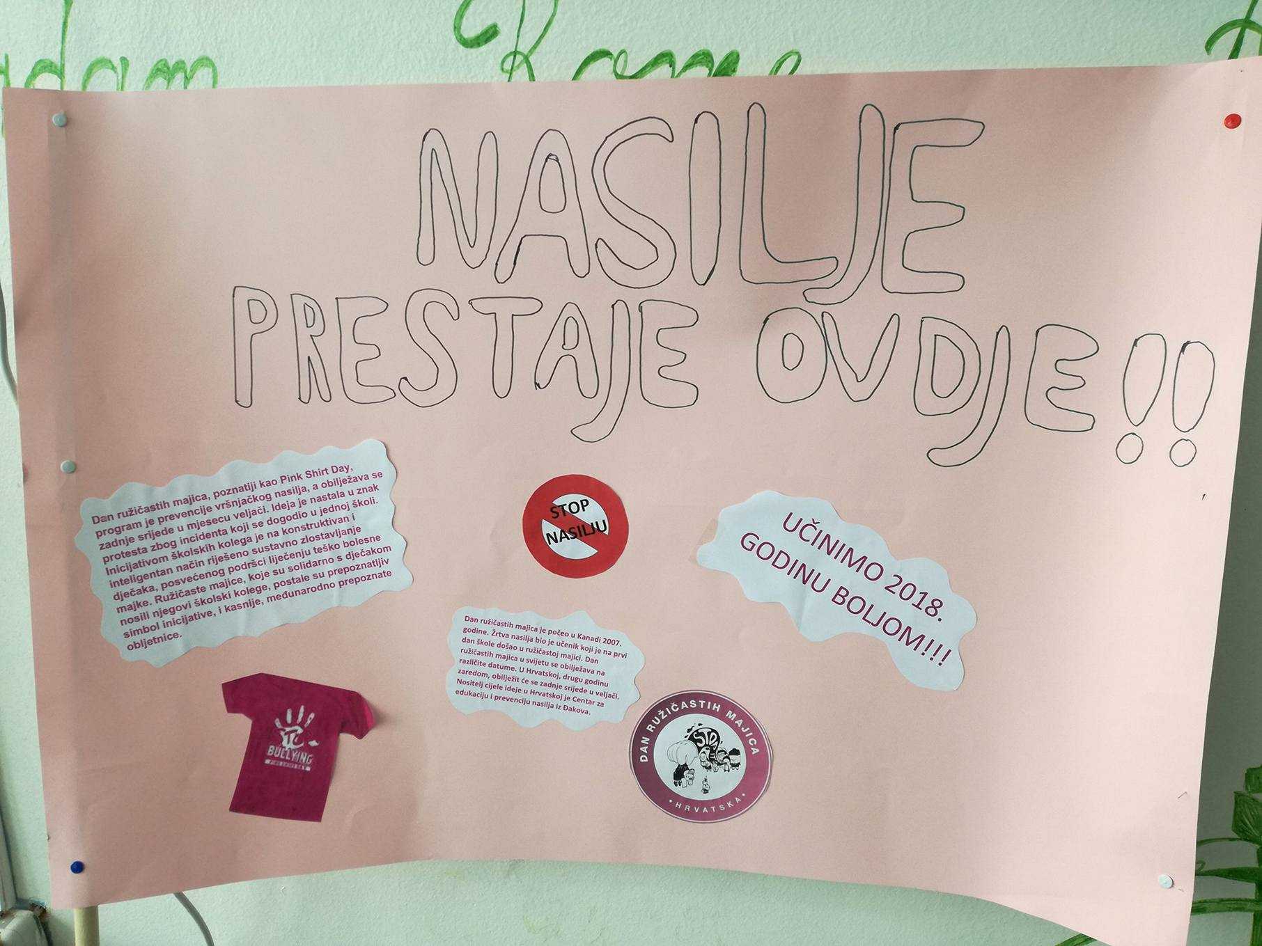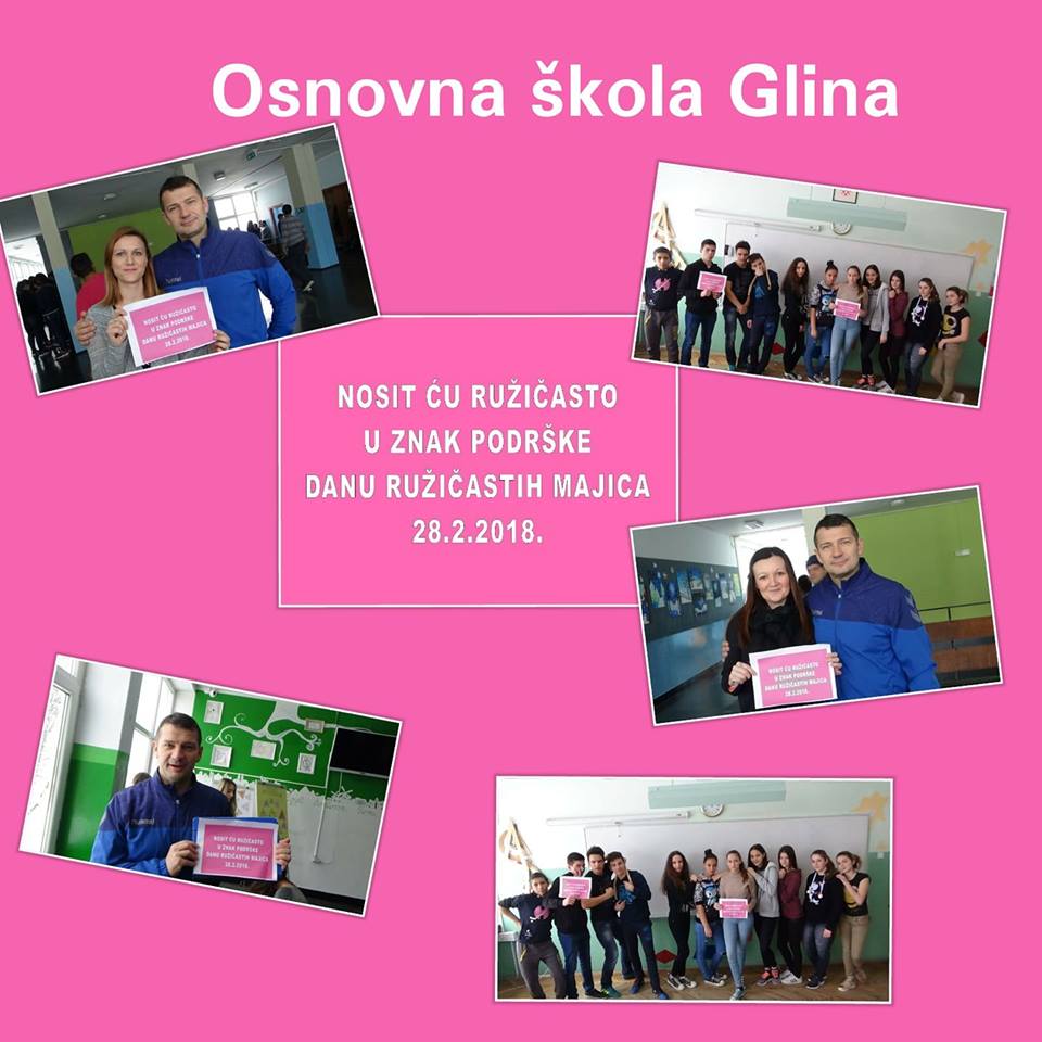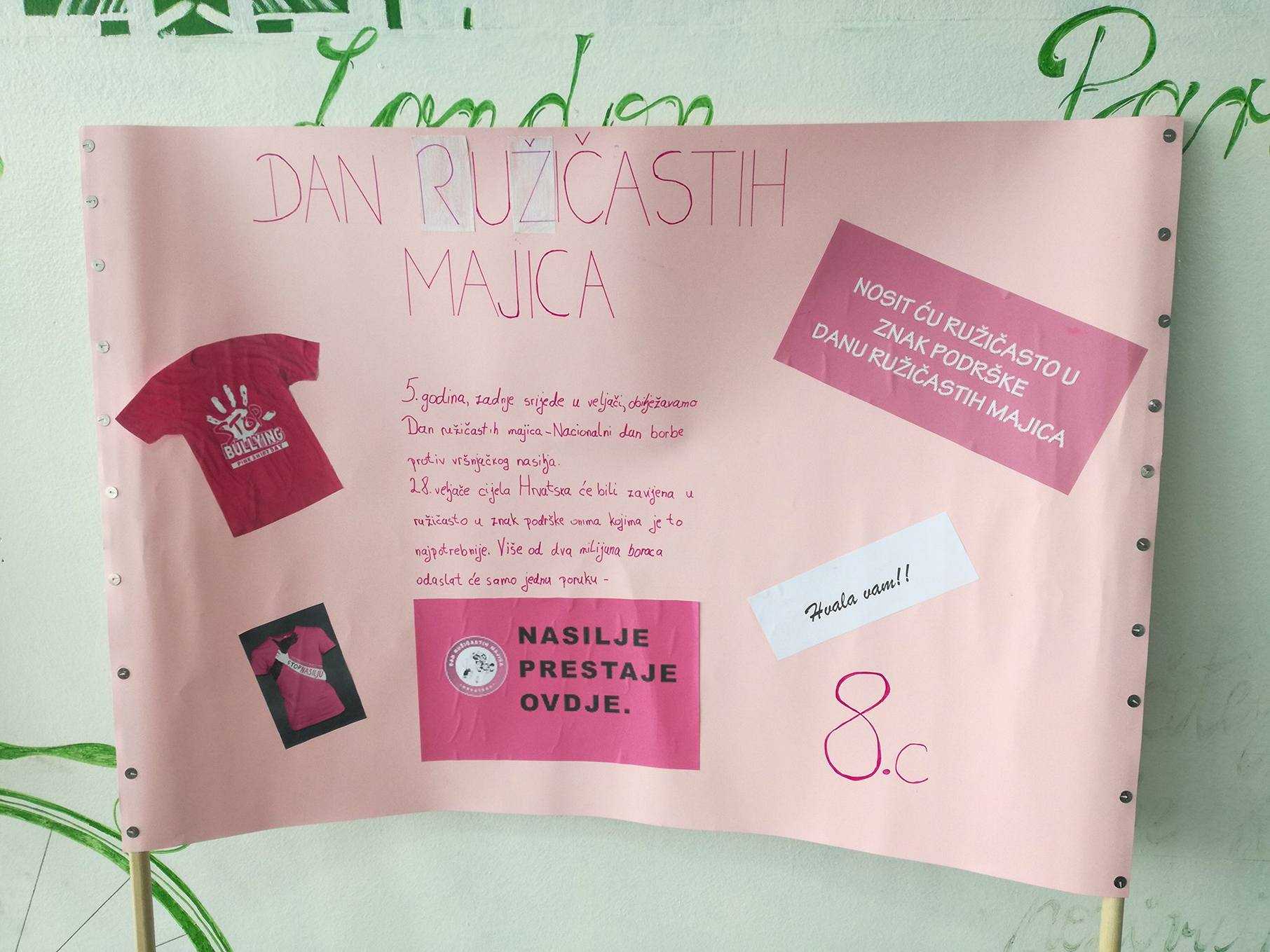 Nositelj cijele ideje u Hrvatskoj je Centar za edukaciju i prevenciju nasilja iz Đakova. Naša škola je dan obilježila tako što su učenici marljivo pripremili plakate i ukrasili školu porukama protiv nasilja, održane su radionice o nasilju, a učitelji su nosili ružičaste majice. Učenici osmih razreda pripremili su prezentacije kojima su nas upoznali s vršnjačkim nasiljem i internet nasiljem. Pogledali smo i edukativne video materijale na temu zlostavljanja na internetu.