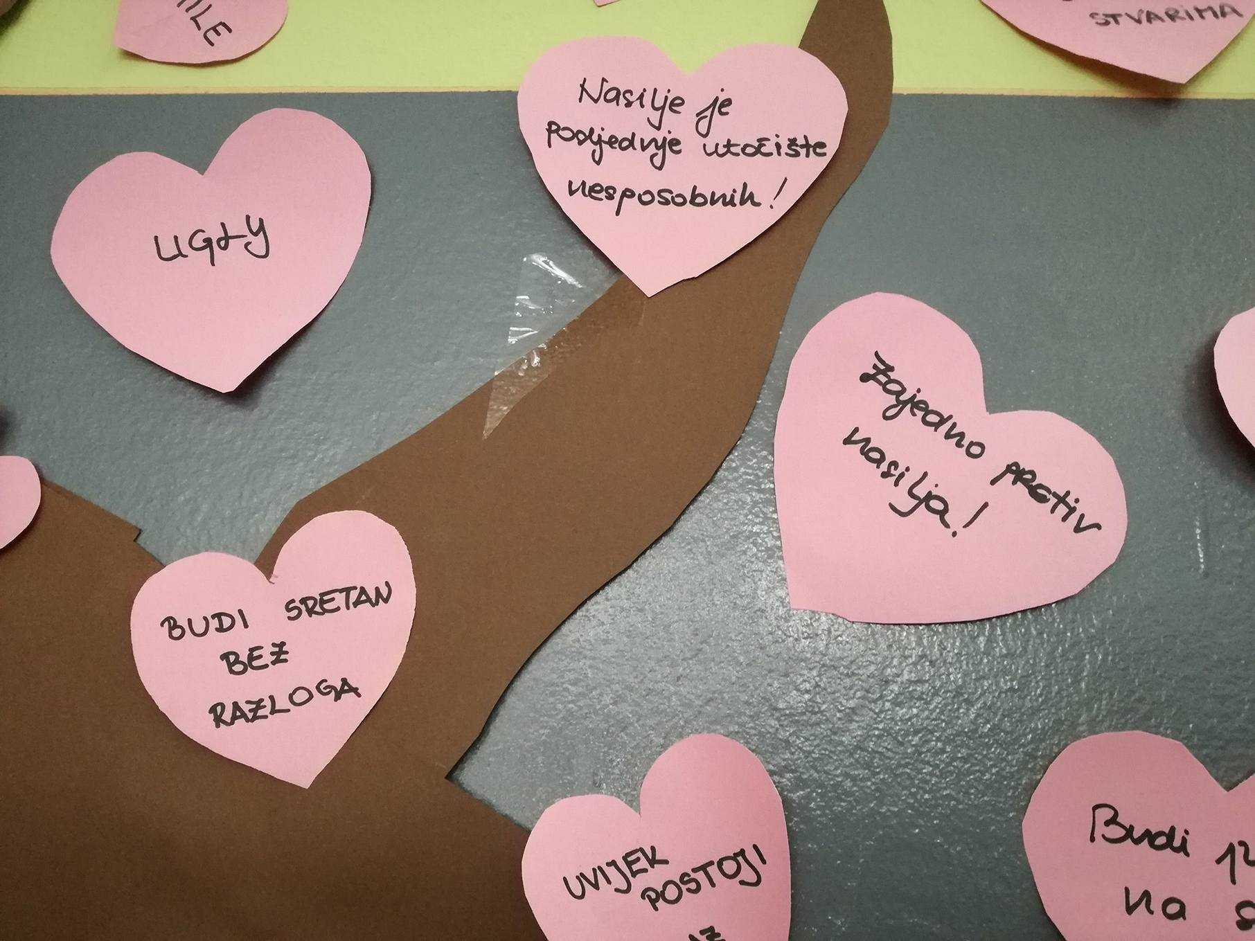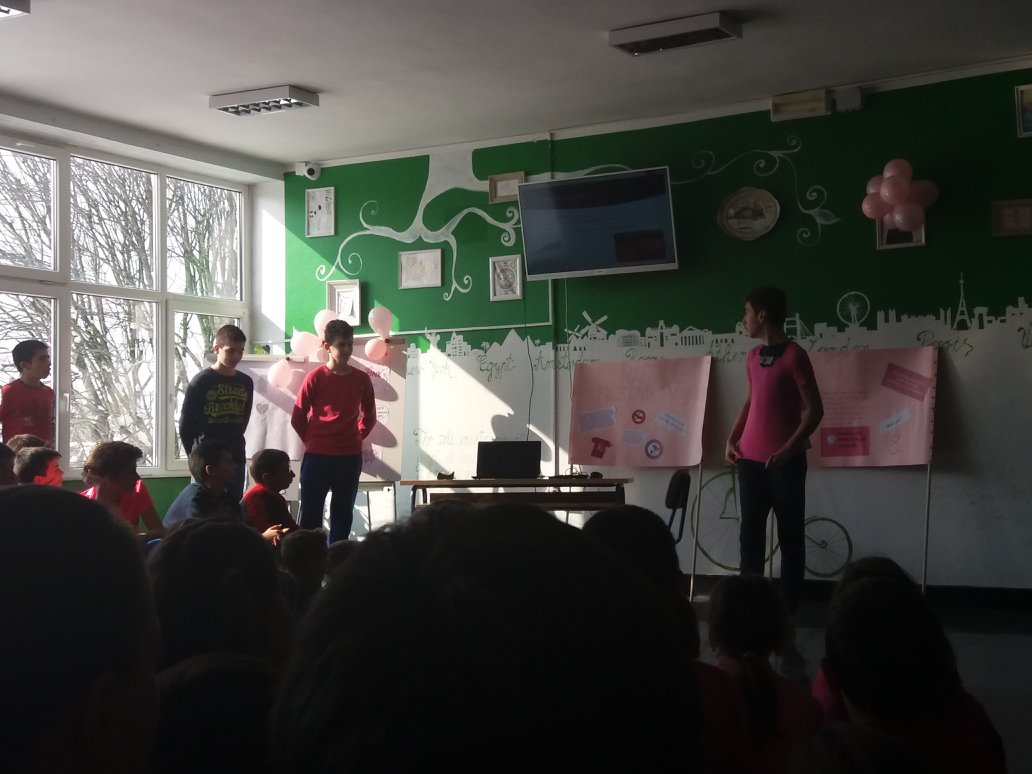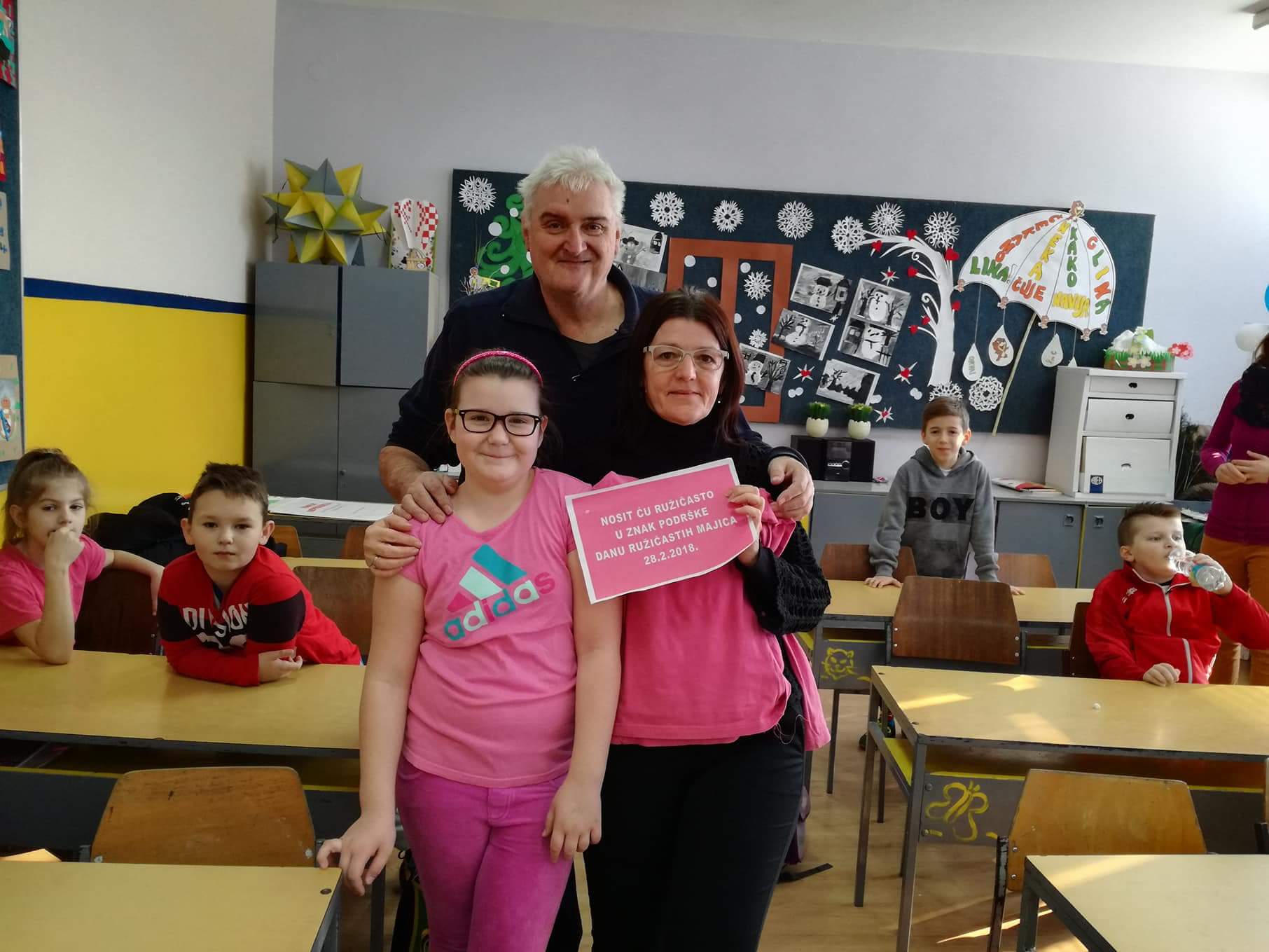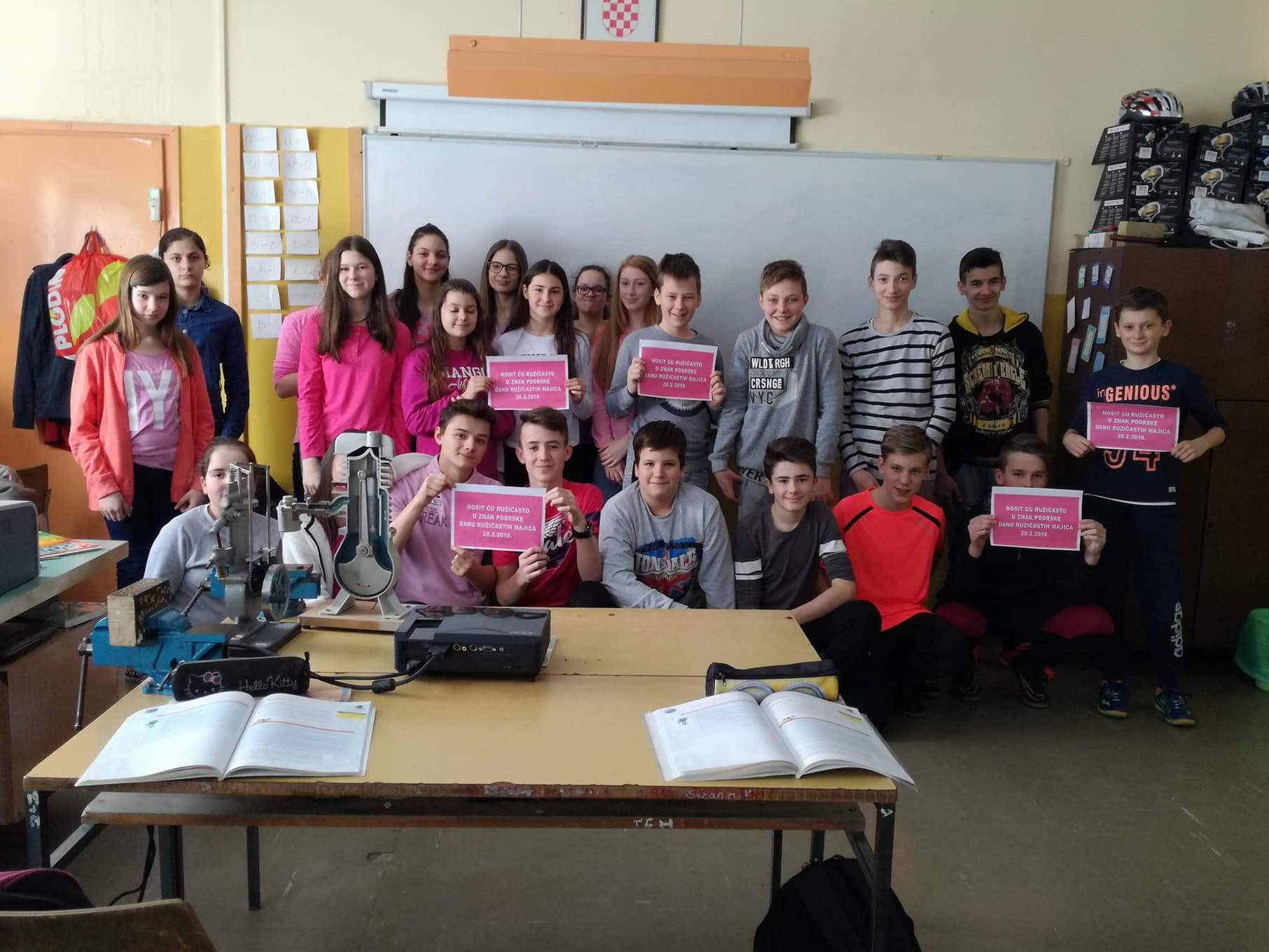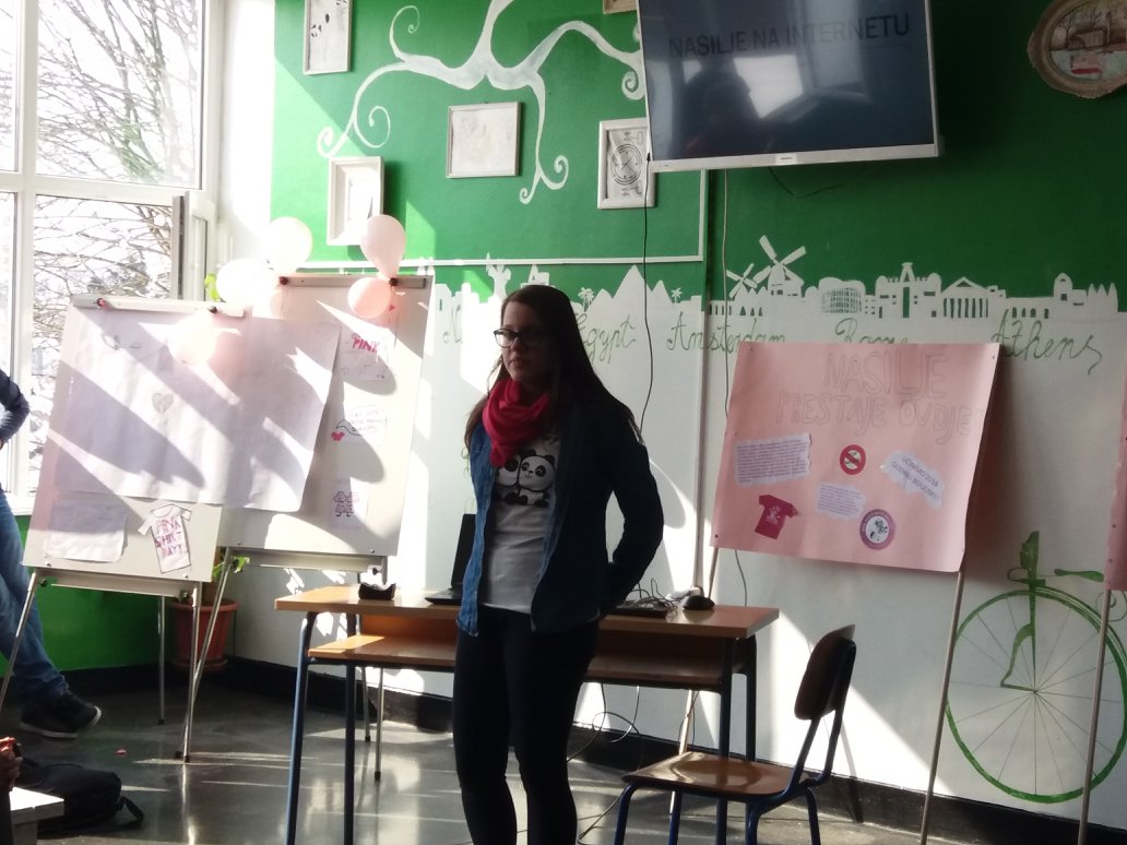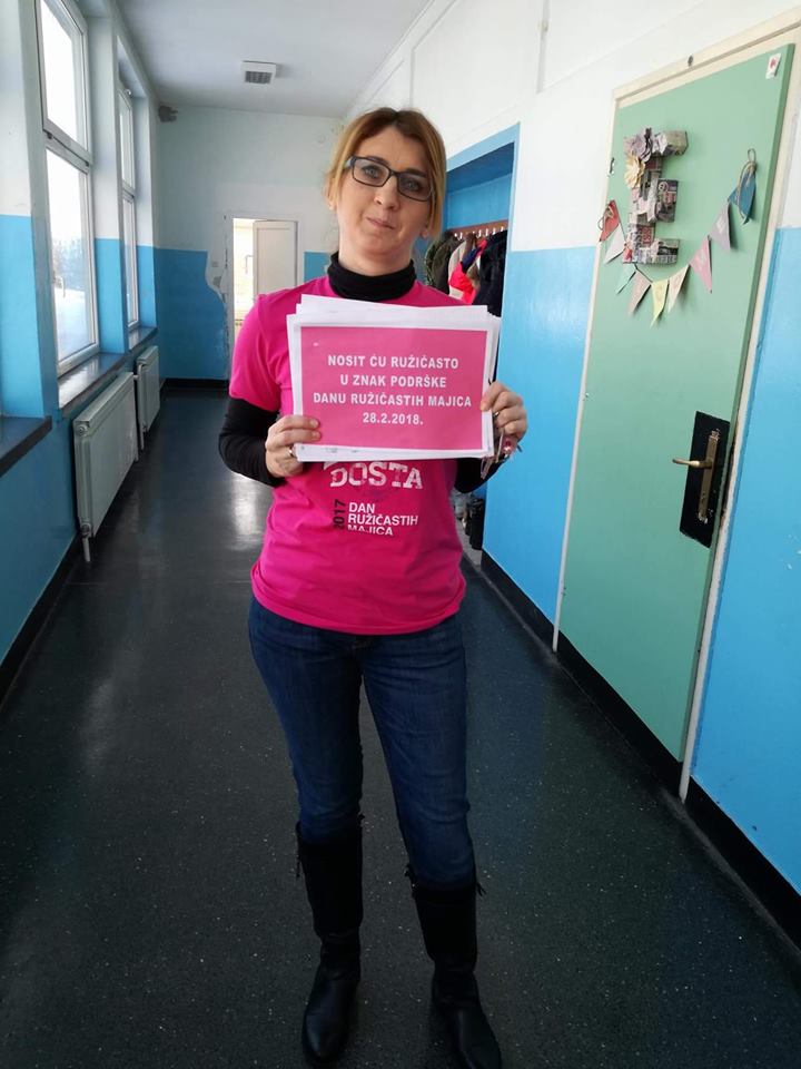 Nositelj cijele ideje u Hrvatskoj je Centar za edukaciju i prevenciju nasilja iz Đakova. Naša škola je dan obilježila tako što su učenici marljivo pripremili plakate i ukrasili školu porukama protiv nasilja, održane su radionice o nasilju, a učitelji su nosili ružičaste majice. Učenici osmih razreda pripremili su prezentacije kojima su nas upoznali s vršnjačkim nasiljem i internet nasiljem. Pogledali smo i edukativne video materijale na temu zlostavljanja na internetu.