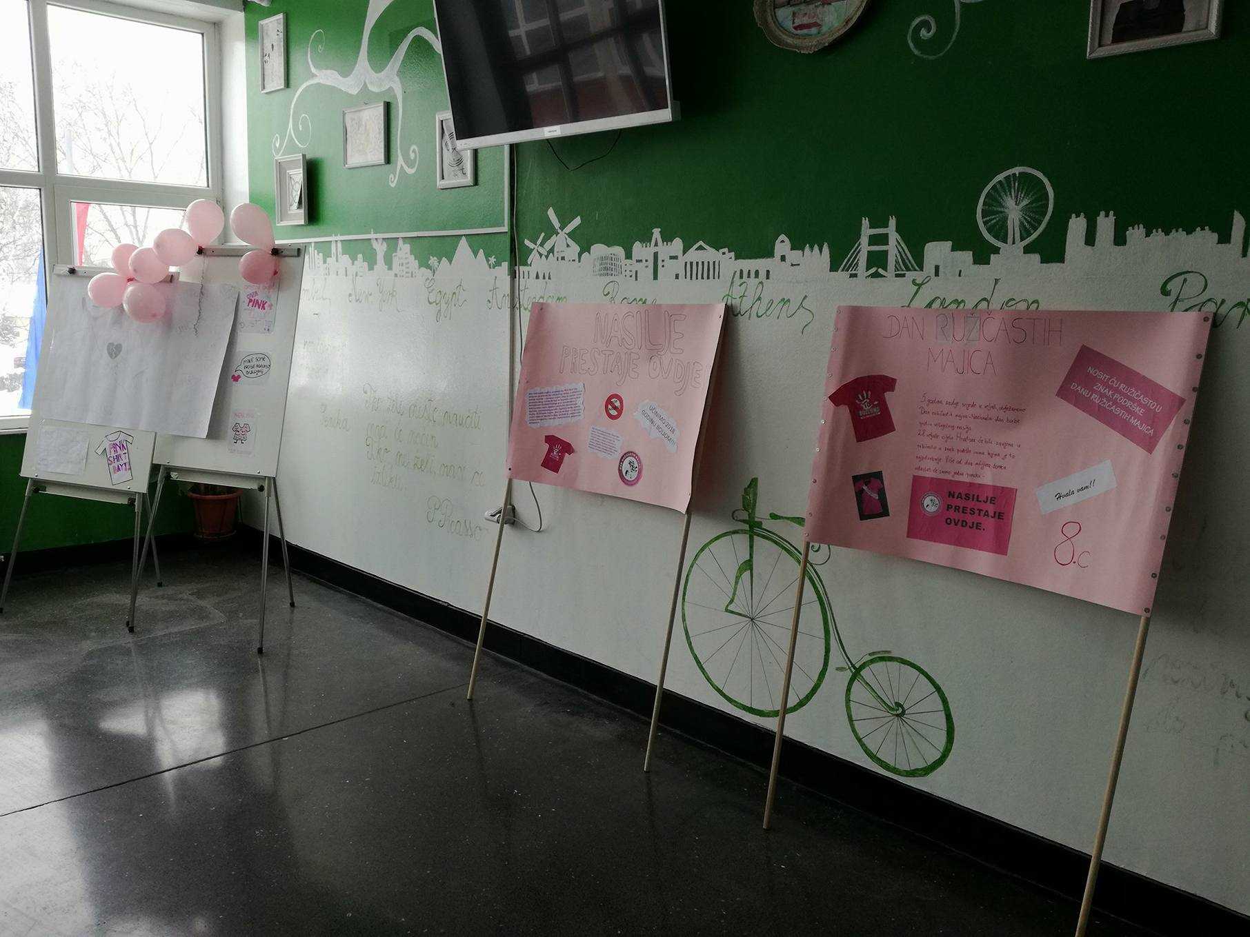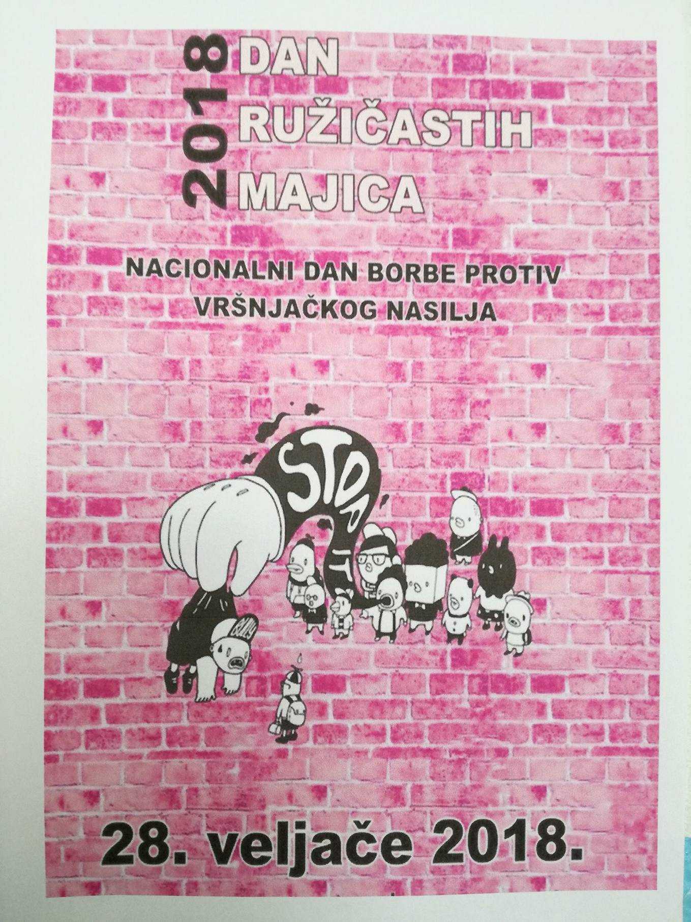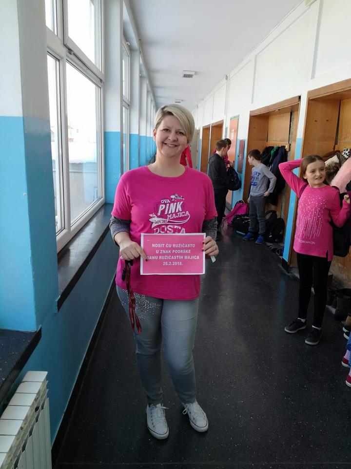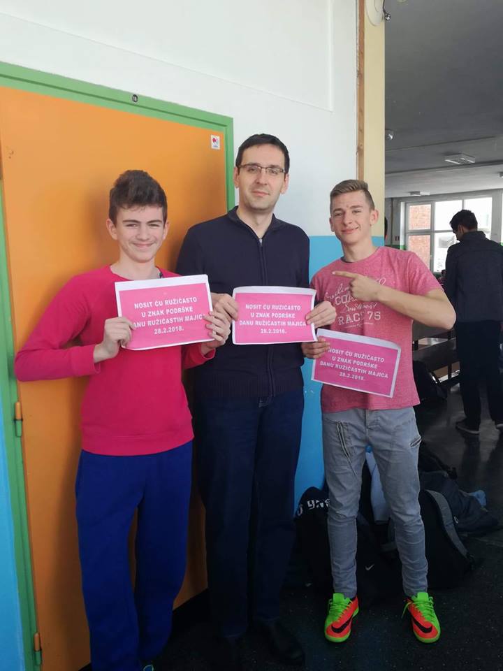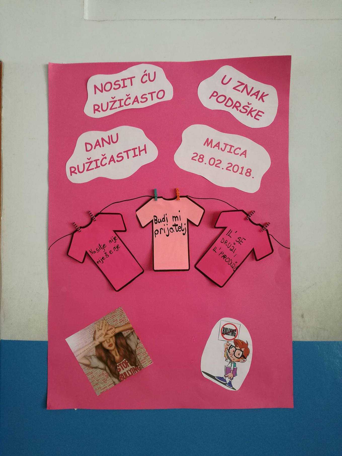 Zadnja srijeda u mjesecu veljači je, kako u našoj školi, tako i na nacionalnoj razini bila u znaku ružičastih majica. Dan ružičastih majica je program prevencije vršnjačkog nasilja, jer smo svjesni činjenice da je nasilje, bilo kojeg oblika, svakodnevno prisutno u svim okruženjima. Inicijativa podrške svim zlostavljanima na bilo koji način i ideja prevencije nasilja je krenula 2007. godine u Kanadi, nakon što je u jednoj školi žrtva nasilja bio dječak koji je na prvi dan škole došao u ružičastoj majici.