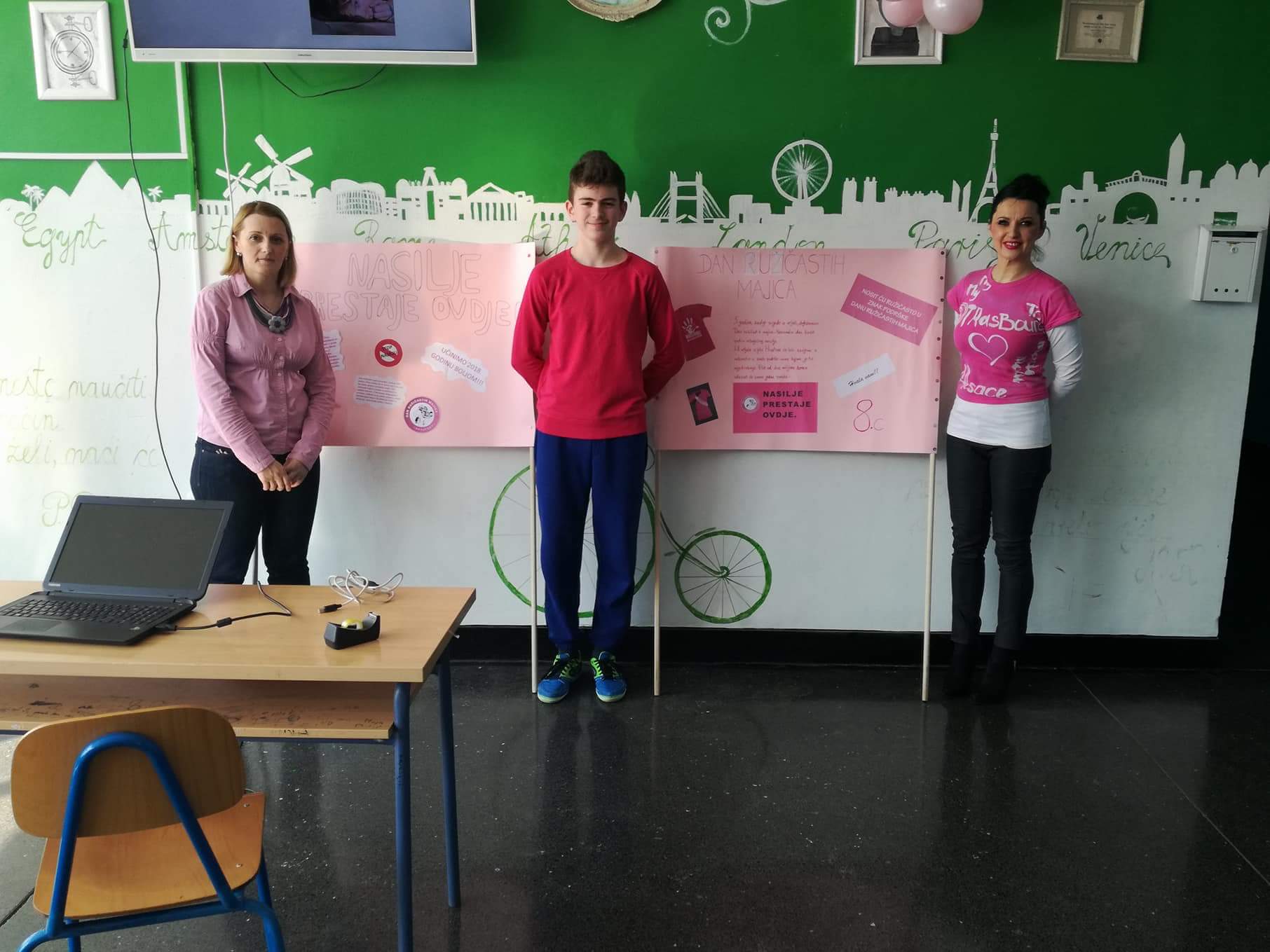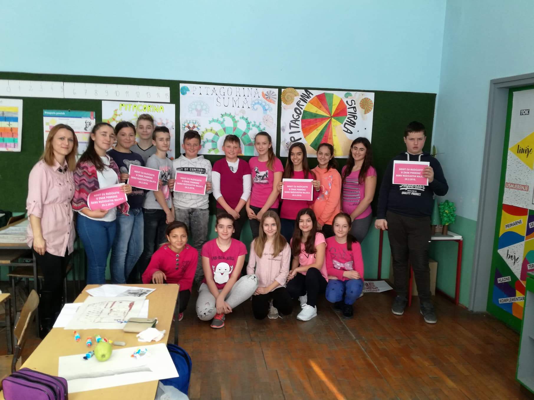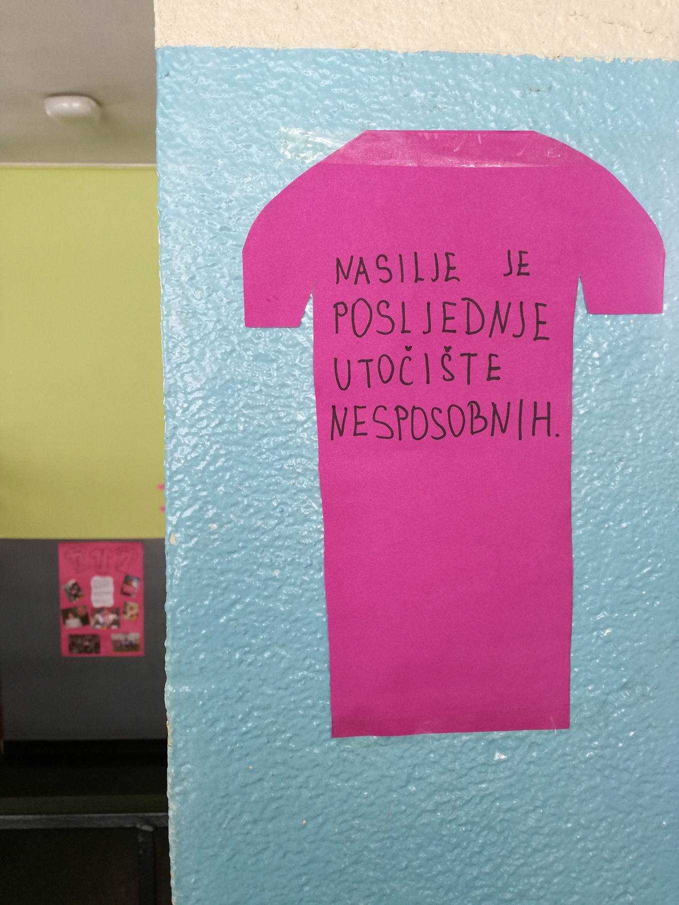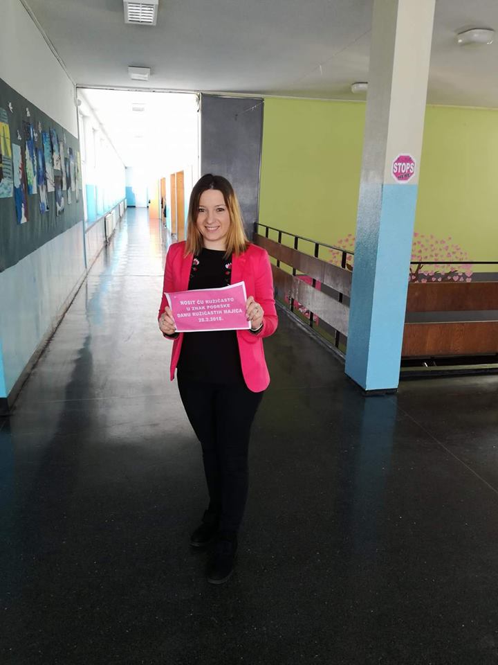 Zadnja srijeda u mjesecu veljači je, kako u našoj školi, tako i na nacionalnoj razini bila u znaku ružičastih majica. Dan ružičastih majica je program prevencije vršnjačkog nasilja, jer smo svjesni činjenice da je nasilje, bilo kojeg oblika, svakodnevno prisutno u svim okruženjima. Inicijativa podrške svim zlostavljanima na bilo koji način i ideja prevencije nasilja je krenula 2007. godine u Kanadi, nakon što je u jednoj školi žrtva nasilja bio dječak koji je na prvi dan škole došao u ružičastoj majici.