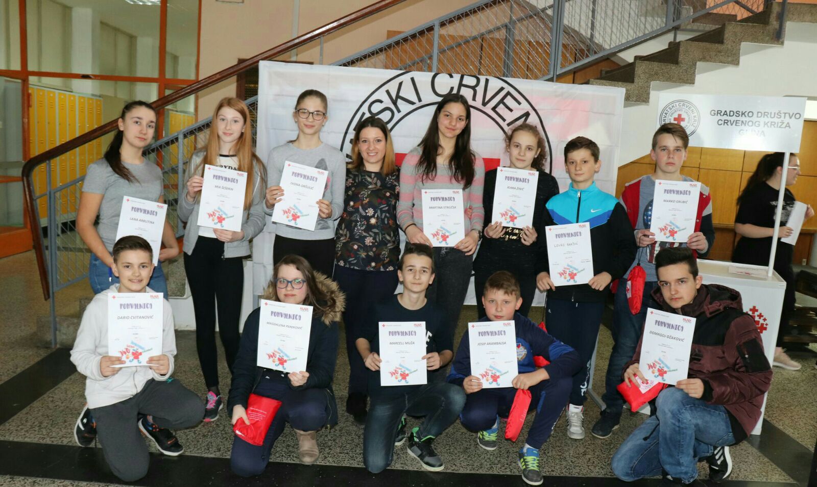Ekipa “Volonter”: Martina Strejček, Ivona Oršulić, Kiara Žinić, Mia Šešerin; Lana Arbutina i Marcell Muža i ekipa “Jedinstvo”: Magdalena Pereković, Lovro Bakšić, Domagoj Ožaković, Marko Grubić, Dario Cvitanović i Josip Arambajsa. Pomladak naše škole vodi mentorica Valentina Pereković Žugaj. Učenici su se natjecali u znanju i vještinama pružanja prve pomoći i povijesti Crvenog križa i međunarodnog humanitarnog prava. Pobjedila je ekipa „Volonter“.