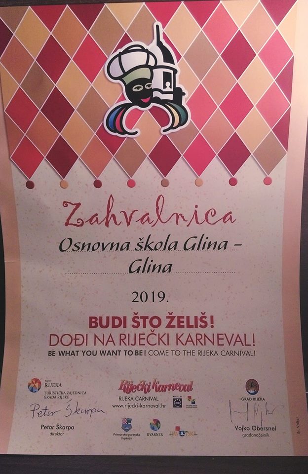 Za sudjelovanje na Riječkom karnevalu Osnovnoj školi Glina dodijeljena je zahvalnica. Posebna zahvala učiteljici Maci Pereković, njenom 3.c razredu, roditeljima, učiteljicama u pratnji Andrijani Kirin, Štefici Ponder, Vesni Netoušek i pedagogu Zoranu Kiriniću.