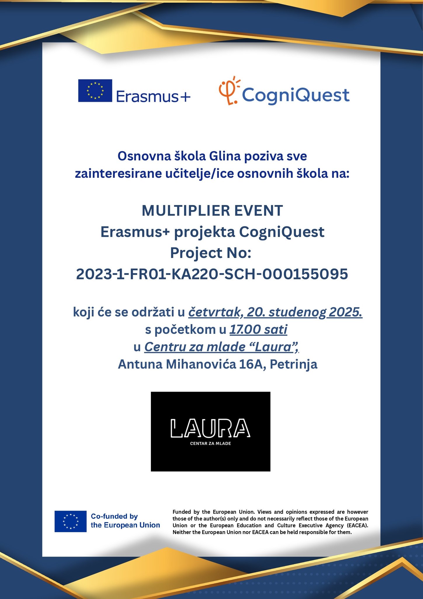 Osnovna škola Glina u četvrtak, 20.studenog 2025. organizira prezentaciju Erasmus+ projekta CogniQuest. Prezentacija je namijenjena svim učiteljicama i učiteljima osnovnih škola koji žele saznati više o primjeni metakognicije u nastavi. Svi ste pozvani i dobrodošli!